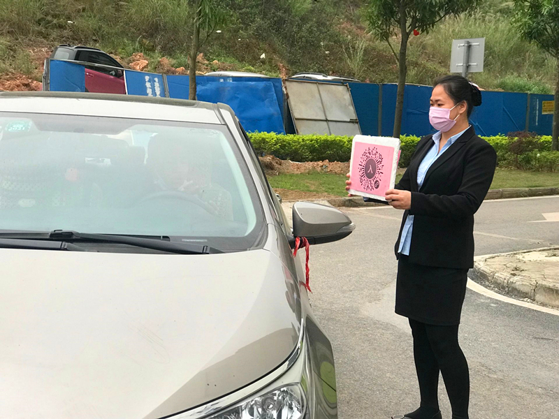 万方公司创意物业服务中心副主任黄春芳为进出园区车辆做扫码登记