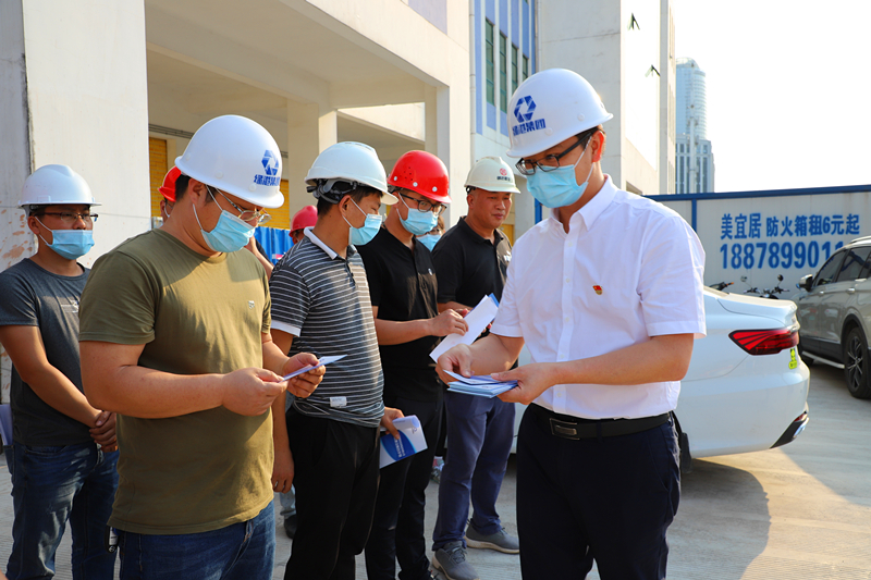 MK国际党委书记、董事长龚国强给项目一线人员发放《工程建设廉政手册》(张彩秀 摄)