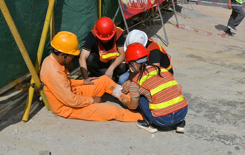 现场模拟一名工人在2#、3#厂房间的廊架上进行施工作业时,因未系安全带、脚下未踩稳造成高处坠落受伤,其他人员对其进行急救的情况。从发现人员坠落受伤、疏散人群、封锁现场到对受伤人员骨折部位用夹板进行固定再送至医院,仅历时10分钟。整个过程紧张有序,应急处理得当。演练中,现场每名救援人员严肃认真对待每个演练细节。各应急小组闻声而动,各司其职,反应迅速,各环节无缝衔接,使救援任务得以顺利完成。