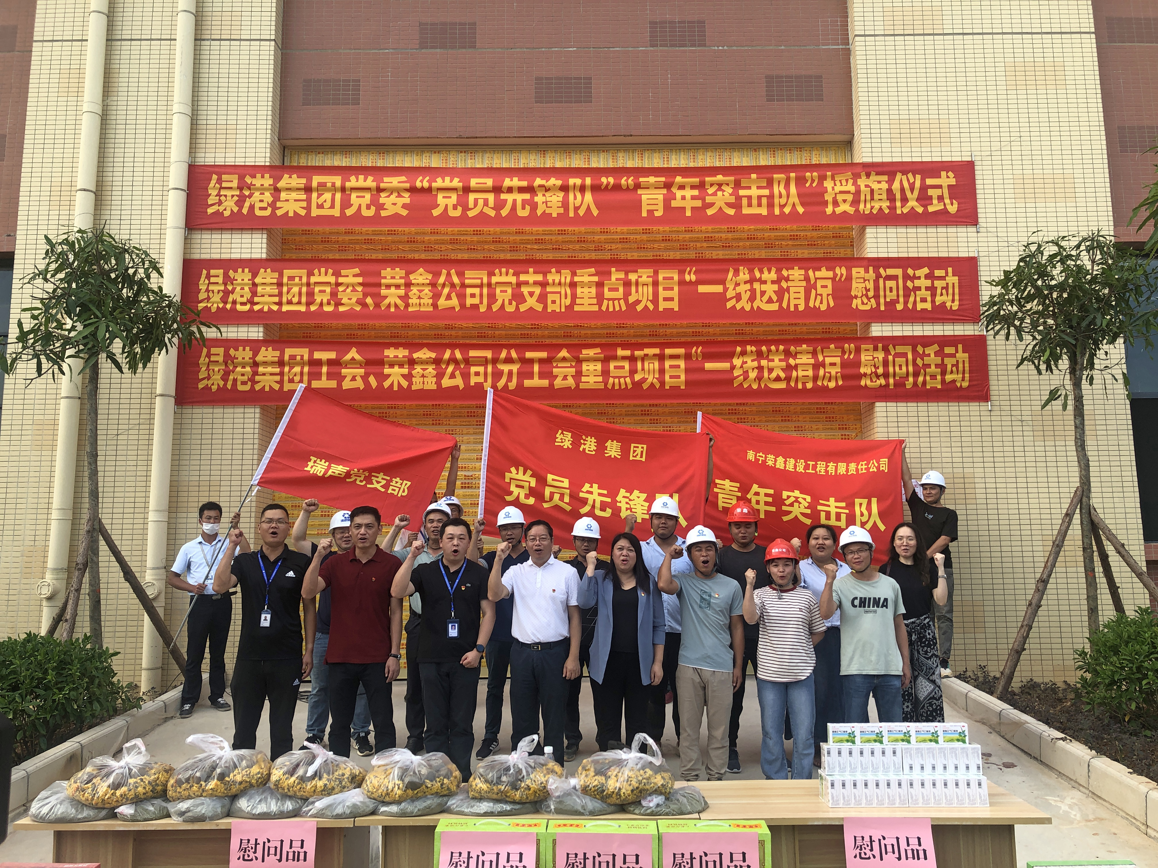 7月14日,由MK国际党委主办,荣鑫公司党支部、荣鑫公司工会承办的 “党员先锋队”“青年突击队”授旗暨“一线送清凉”活动在瑞声三期项目现场开展。荣鑫公司党支部书记、总经理李汝埠带领荣鑫公司领导班子,顶着烈日、迎着热浪,来到集团重点项目——瑞声科技(南宁)厂房装修工程(三期)施工现场,亲切看望慰问在炎炎夏日中奋战在项目建设一线的“党员先锋队”“青年突击队”队员及各施工班组的建设者,送去了集团党委、荣鑫公司党支部、荣鑫公司工会的关心和敬意,为他们加油鼓劲、提振士气。瑞声科技(南宁)有限公司副总经理李博及项目相关负责人参加活动。