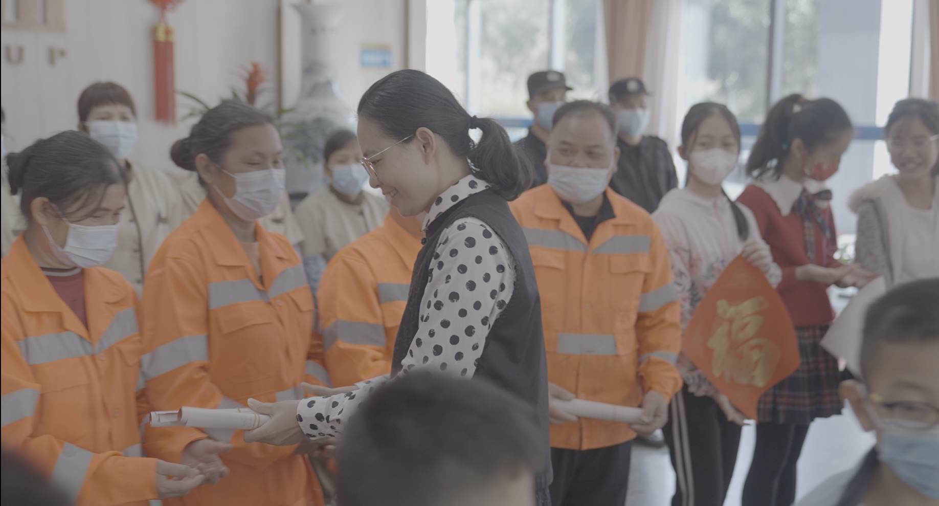 一平一仄谱喜悦,一撇一捺书祝福,活动最后,公司领导及志愿者们向30名来自一线的市政、绿化工人与物业服务人员赠送了春联,并向他们表达了浓浓的关怀和新春祝福。“春节贴春联是我们的传统习俗,过年的时候在家门口贴上亲手写的“福”字就更有意义了,非常感谢集团公司在每年春节即将到来之际给我们送来这么好的礼物。”荣鑫公司绿化工人唐素厢拿到春联后高兴地说。
