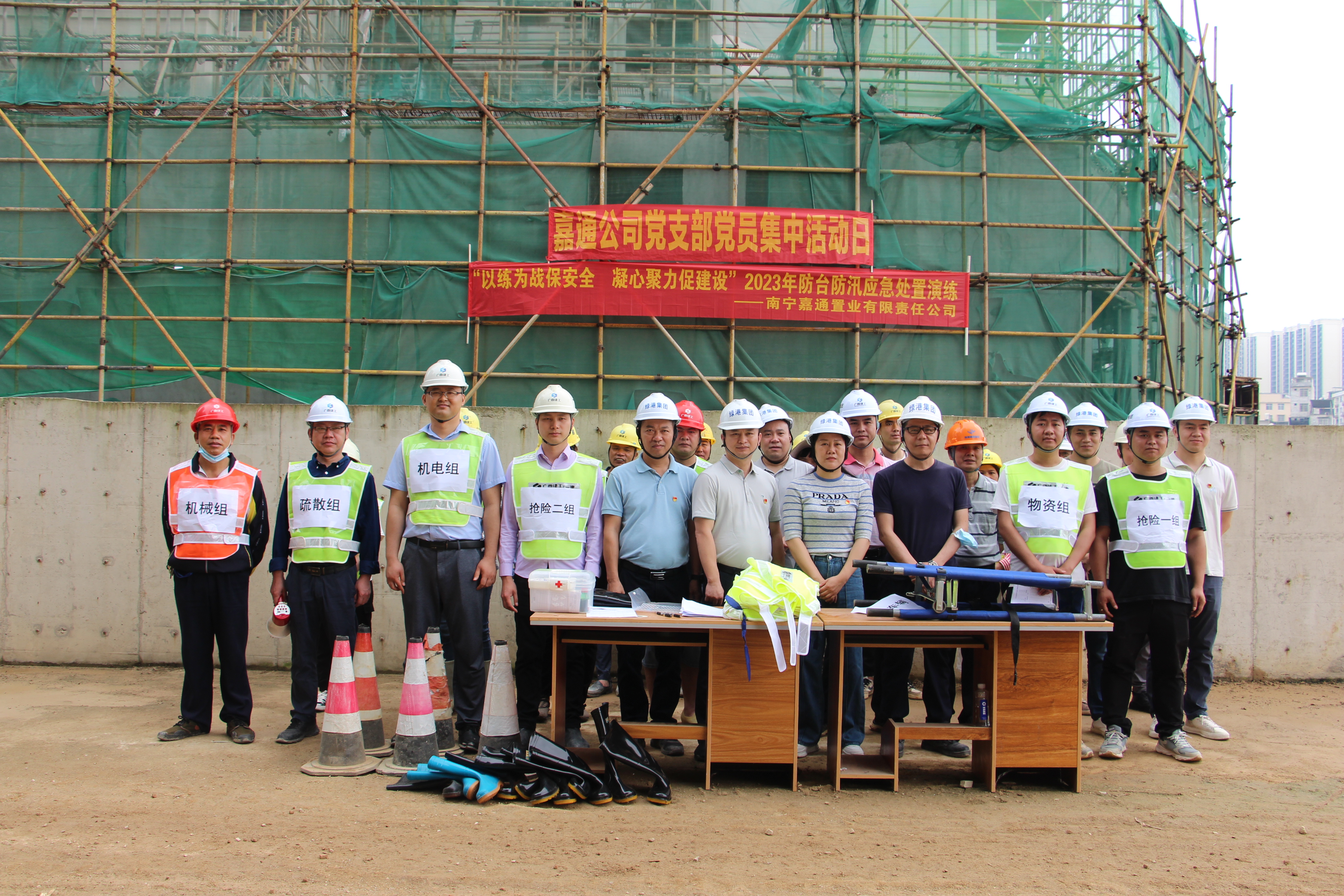 为进一步提升项目管理人员应对汛情的应急处置能力,提高员工防台防汛的安全意识,保障项目现场的设备和人身财产安全,4月19日,嘉通公司联合施工单位广西建工第一建筑工程集团有限公司在绿港·尚尊一品项目现场开展“以练为战保安全 凝心聚力促建设”2023年防台防汛应急处置演练,全面筑牢安全生产防线。MK国际安全监督部、项目负责人、业主代表及一线施工人员约30人参加本次活动。集团党委委员、副总经理黄丽琴到现场观摩指导并作防台防汛工作部署。嘉通公司党支部书记、总经理何小勇在演练前致辞。