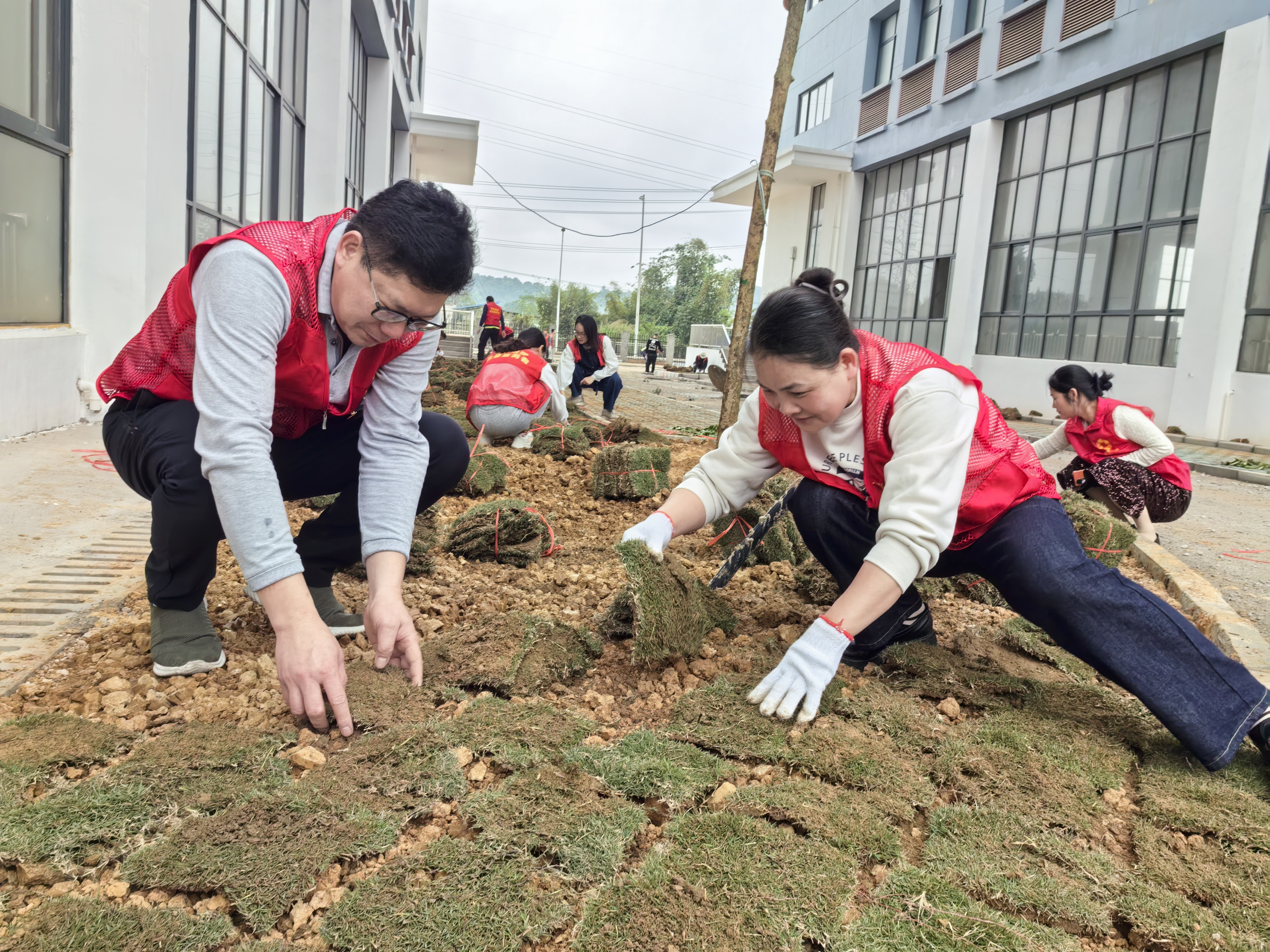 “这棵树苗要扶正,不然长大后会歪的。”荣鑫公司党支部委员、副总经理唐钦月一边指导身边的同事,一边用脚轻轻踩实树苗周围的泥土。她笑着说:“植树就像培养孩子,一开始就要打下好基础。”她的脸上挂着汗珠,但眼神中满是认真。不远处,年轻的入党积极分子杨文君正和同事们一起铺设草皮。他们动作熟练,配合默契,不一会儿就铺出了一大片嫩绿的草地。杨文君擦了擦额头的汗水,笑着说:“今天虽然累,但看到这片新绿,心里特别踏实。作为入党积极分子,能和党员们一起为生态环境出一份力,感觉特别有意义。”
